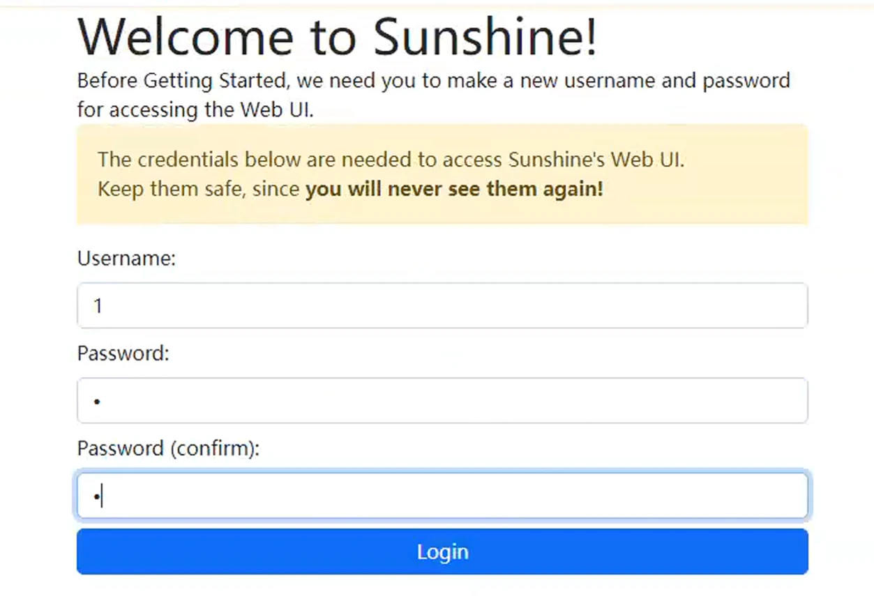 NET::ERR_CERT_AUTHORITY_INVALID错误,点击高级 -> 继续。 - 现在您将进入 Sunshine 设置页面。